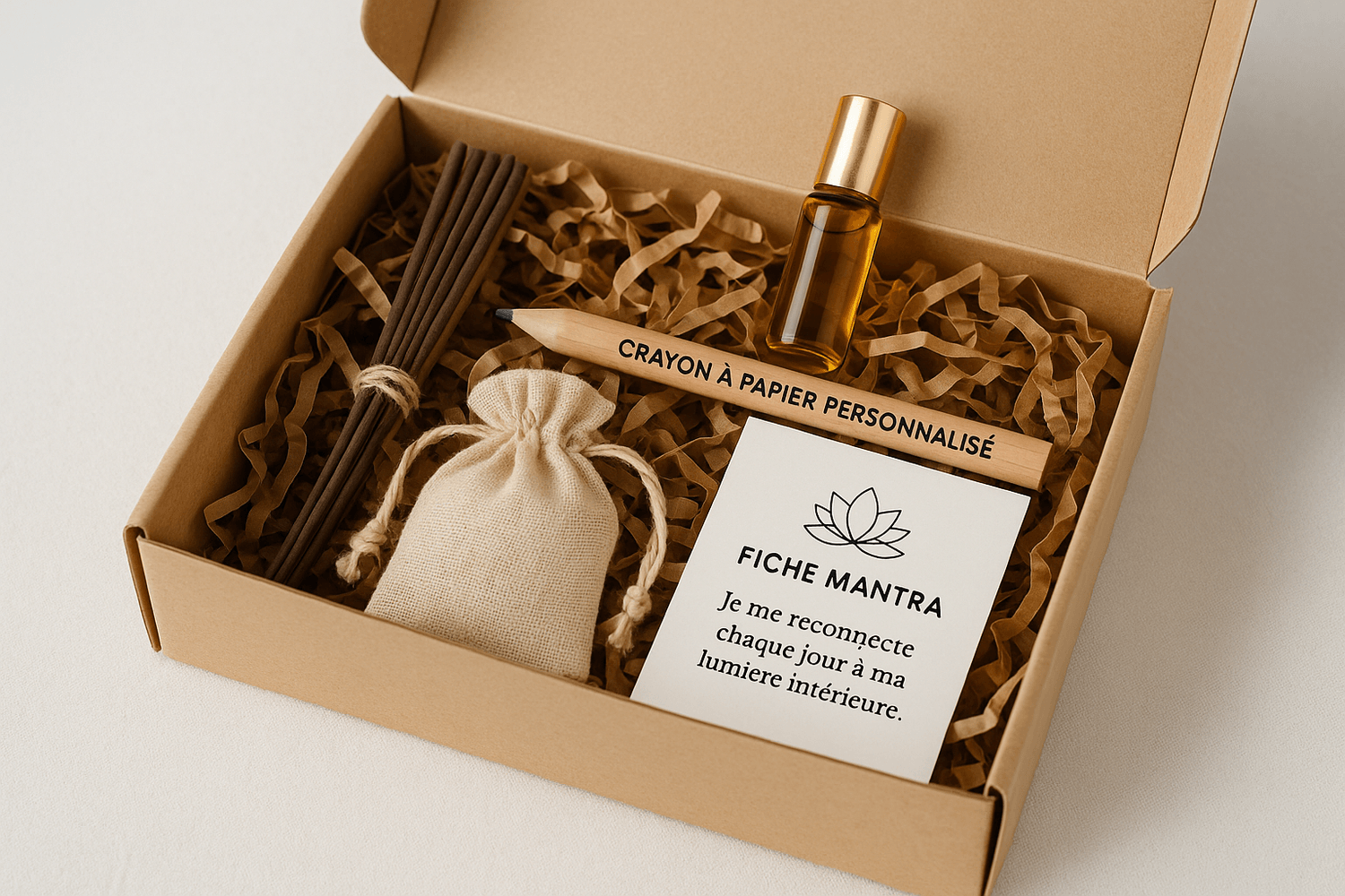 Encens, graines à planter, fiche mantra, roll-on aux pierres semi-précieuses, papeterie inspirante ou objet énergétique surprise.